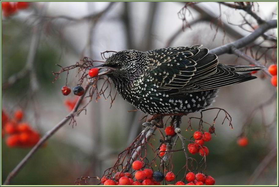 Die ersten Stare (Sturnus vulgaris) im hell getupftes Federkleid. Falls der Winter bleibt steht ihnen eine harte Zeit bevor.